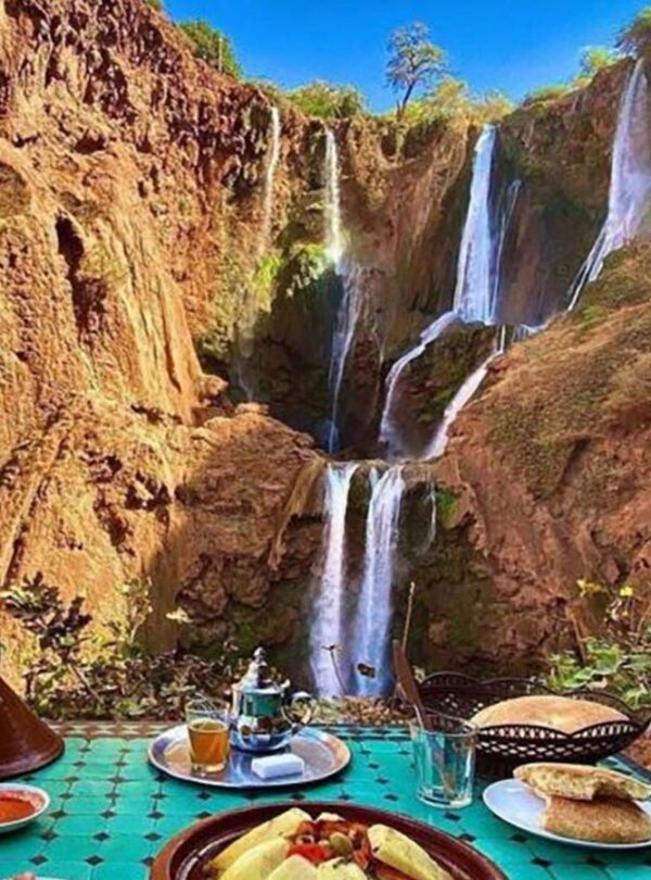 Ouzoud in Berber means “olive”, which refers to the cultivation of olives in this area), which rushed from a height of 110 meters into the river. Free time to explore and discover the wonderful landscape at your own pace. visit cafes at the edge of the water, or check out the Barbary apes that live in the lush river valley. You also can have lunch (Berber Tagine) on-site in front of the waterfalls (optional)