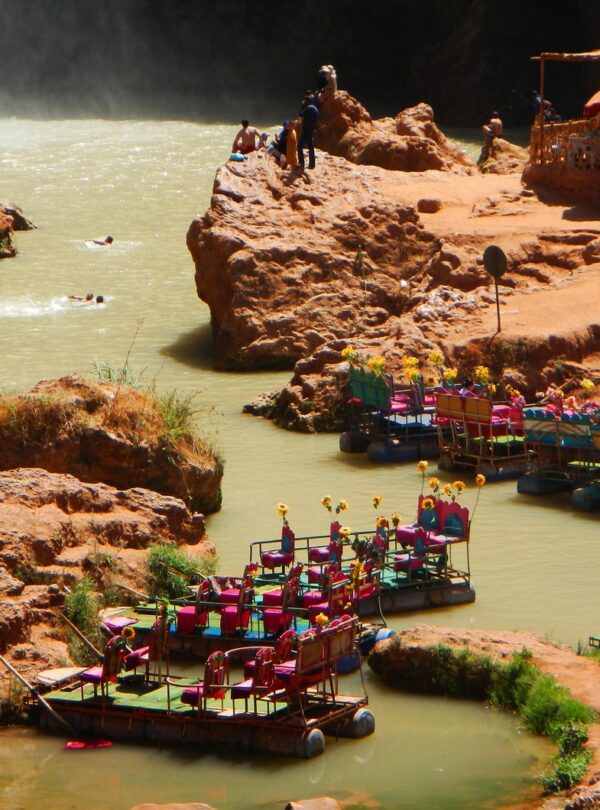 Pick up from your hotel in Marrakech around 8H00 am and departure to Ouzoud Waterfalls located by the village of Tanaghmeilt in the Middle Atlas Mountains, in the province of Azilal, 150 km northeast of Marrakech. Ouzoud’ means “the act of grinding grain” in Berber. The Ozoud Waterfalls (Cascades d’Ouzoud) are Morocco’s highest falls. They are a magnificent sight, tumbling 361 feet (110 meters) through a dramatic red-rock gorge of El Abid River.